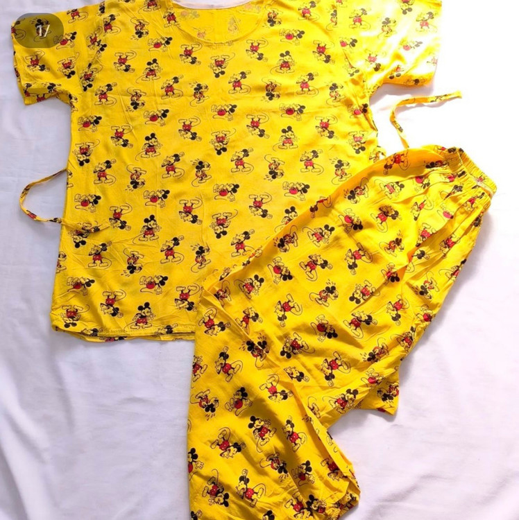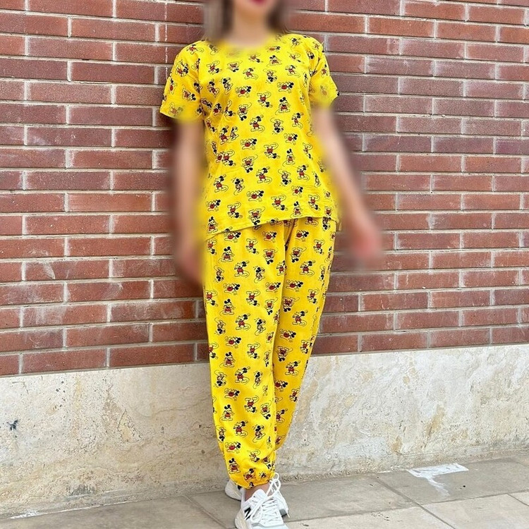 ست تیشرت و شلوار نخی زنانه طرح میکس موس ست ر احتی زنانه فری سایز مناسب سایز 38 تا 48