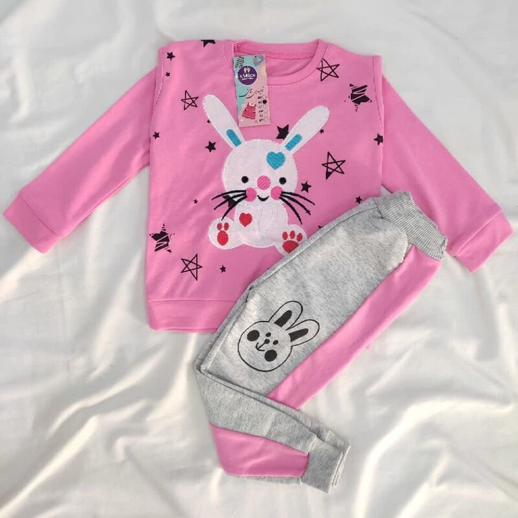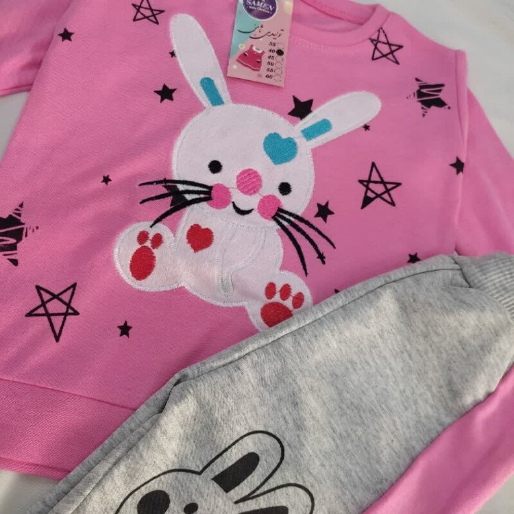 بلوز شلوار دخترانه گلدوزی خرگوش جنس پارچه نخ پنبه لاکرا پشت دورس راهنمای سایز را لطفا با لباس فرزندتان چک کنید