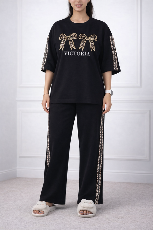 ✨ ست تیشرت و شلوار نیم بگ پاپیونی نوار پلنگی زنانه