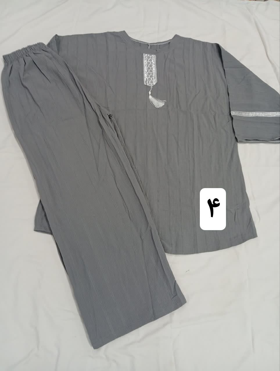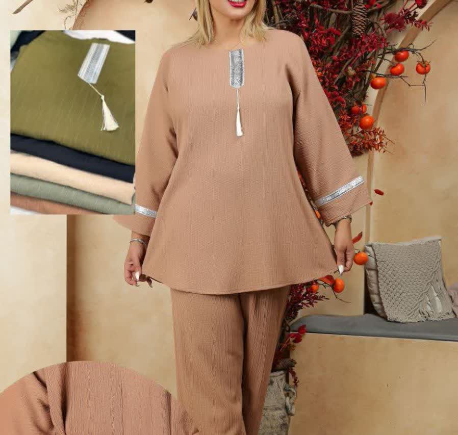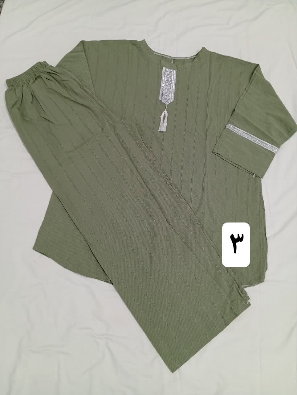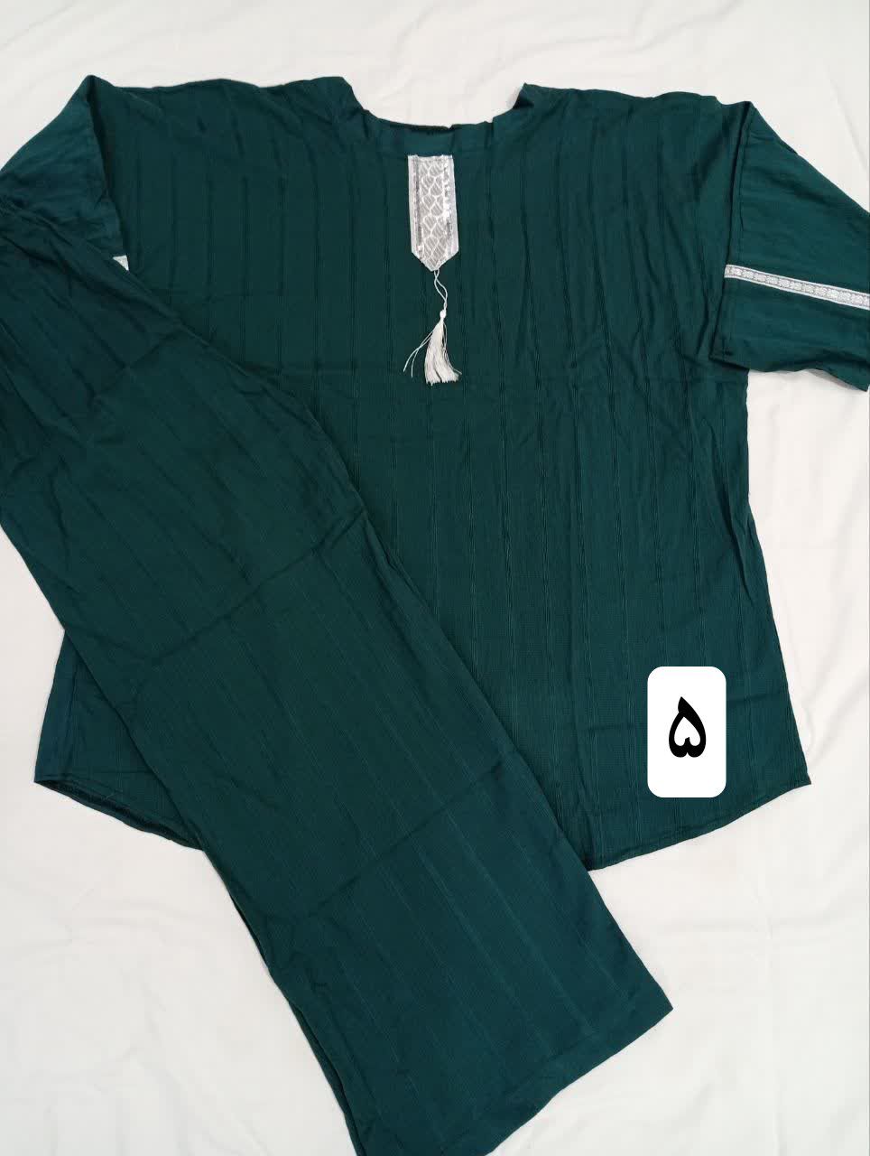 ست تونیک و شلوار جنس کراش آیوا درجه یک نوار دار مناسب سایز۴۲ تا ۵۲ تنخور شیک و جنس عالی دور سینه ۱۲۴ قد تونیک ۸۰ قد آستین از یقه ۶۲ قد شلوار ۱۰۰ دورباسن ۱۲۲ دور ران ۶۴